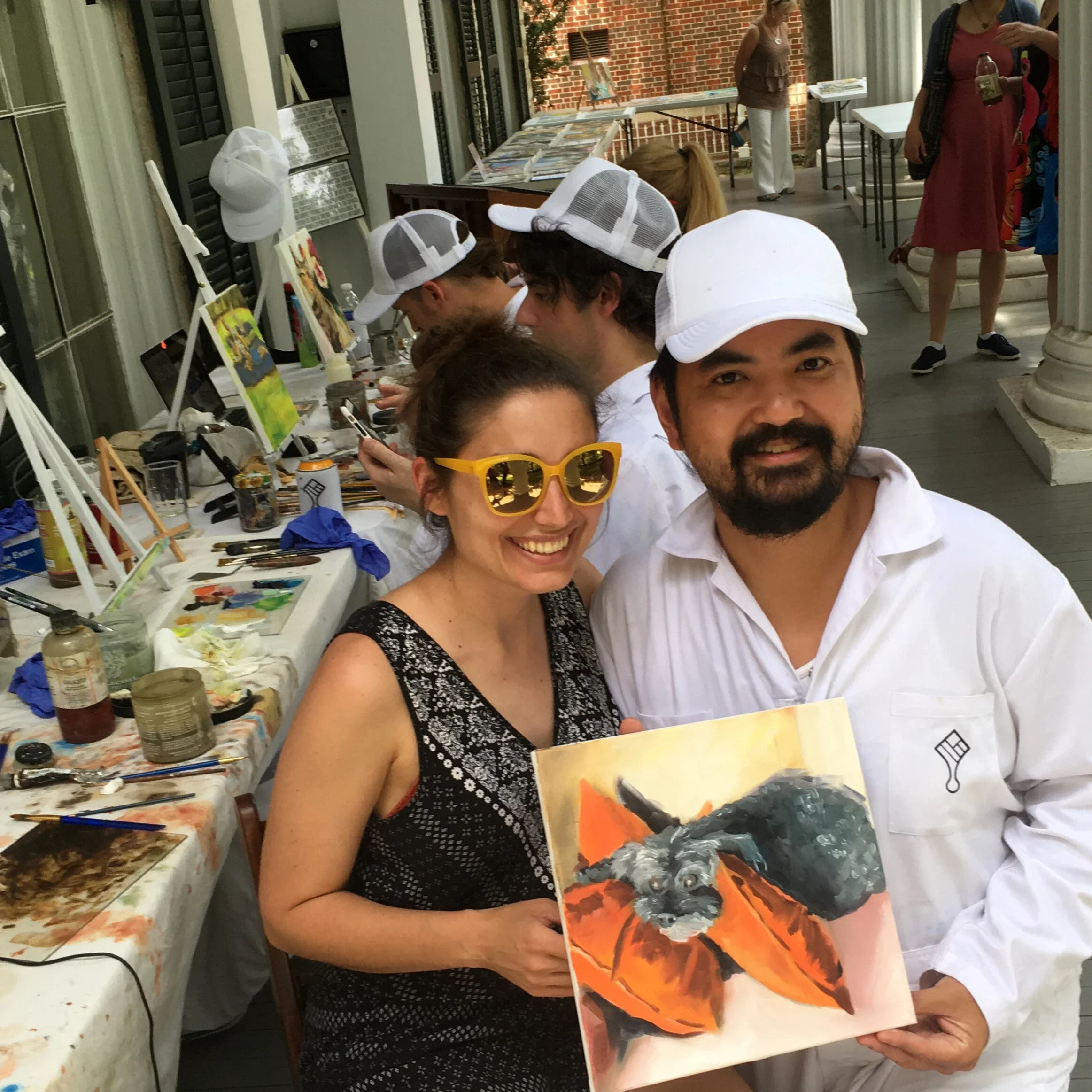 Live dog portrait oil painting, featuring a one-night-only reunion of the three-artist assembly line collective American Cheese Fondue (Thomas Cook, Jeffrey Primeaux, and Saul Jerome San Juan).